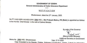 ଭୁବନେଶ୍ୱର,୨୮/୦୧/୨୦୨୫ (ଓଡ଼ିଶା ସମାଚାର)- ଅବସରପ୍ରାପ୍ତ ଆଇଏଏସ୍ ଅଧିକାରୀ ମଧୁସୂଦନ ପାଢୀଙ୍କୁ ରାଜ୍ୟ ନିର୍ବାଚନ କମିଶନର ଓ ପୂର୍ବତନ ଆଇପିଏସ୍ ଅଫିସର ପ୍ରକାଶ ମିଶ୍ରଙ୍କୁ ମୁଖ୍ୟମନ୍ତ୍ରୀଙ୍କ ପରାମର୍ଶଦାତା ଭାବରେ ନିଯୁକ୍ତି ମିଳିଛି। ସୋମବାର ଏନେଇ ସରକାରୀ ଭାବରେ ବିଜ୍ଞପ୍ତି ପ୍ରକାଶ ପାଇଛି। ପ୍ରକାଶଙ୍କୁ ଏହି ନୂତନ ନିଯୁକ୍ତି ଦିଆଯିବା ସହ କ୍ୟାବିନେଟ୍ ରାଙ୍କ୍ ମଧ୍ୟ ପ୍ରଦାନ କରାଯାଇଛି।