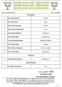 ଭୁବନେଶ୍ୱର,୧୬/୧୦/୨୦୨୫ (ଓଡ଼ିଶା ସମାଚା/ଦୀପ୍ତିରଂଜନ କାନୁନଗୋ)-ରାଜ୍ୟ ବିଜେପିର ନୂଆ କମିଟି ଗଠନ କରାଯାଇଛି। ଏଥିରେ ୪ ଜଣ ସାଧାରଣ ସମ୍ପାଦକ, ୧୦ ଜଣ ଉପସଭାପତି, ୧୦ ଜଣ ସମ୍ପାଦକ, ଜଣେ କୋଷାଧ୍ୟକ୍ଷ ଏବଂ ଜଣେ ଯୁଗ୍ମ କୋଷାଧ୍ୟକ୍ଷଙ୍କୁ ନିଯୁକ୍ତ କରାଯାଇଛି। ବିଜେପି ରାଜ୍ୟ ସଭାପତି ମନମୋହନ ସାମଲଙ୍କ ଅନୁମୋଦନ କ୍ରମେ ଏହା ଘୋଷଣା କରାଯାଇଛି।