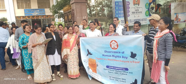 କଟକ, ୧୦/୧୨/୨୦୨୫ (ଓଡ଼ିଶା ସମାଚାର)- ସଖୀ ୱାନ ଷ୍ଟପ ସେଣ୍ଟର୍ ତରଫ ରୁ ସମାଜରୁ ଲିଙ୍ଗଗତ ଭେଦଭାବ ତଥା ମହିଳା ହିଂସା ଦୂରୀକରଣ ନିମନ୍ତେ ଆନ୍ତର୍ଜାତୀୟ ସ୍ଥରରେ ପାଳିତ ୧୬ ଦିନିଆ କାର୍ଯ୍ୟକ୍ରମ ର ଅନ୍ତିମ ଦିନ ଉପଲକ୍ଷେ ଏସ.ସି.ବି ମେଡ଼ିକାଲ ର ମାନସିକ ବିଭାଗ ସମ୍ମୁଖରେ ମାନବାଧିକାର ଦିବସ ଜିଲ୍ଲା ପ୍ରଶାସନ ର ସହୟତାରେ ପାଳନ ହୋଇଯାଇଛି।