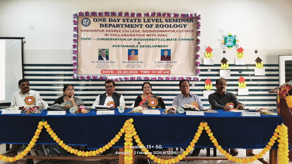 କଟକ ସଦର,୦୨/୦୨/୨୦୨୬ (ଓଡ଼ିଶା ସମାଚାର /ବିଷ୍ଣୁ ବେହେରା): କଟକ ସଦର ଅନ୍ତର୍ଗତ କନ୍ଦରପୁର କଲେଜରେ ପ୍ରାଣୀବିଜ୍ଞାନ ବିଭାଗ ପକ୍ଷରୁ ଏକ ରାଜ୍ୟସ୍ତରୀୟ ବିଷୟ ଭିତ୍ତିକ ଆଲୋଚନା ଚକ୍ର (ସେମିନାର) ଅନୁଷ୍ଠିତ ହୋଇଯାଇଛି। ଏହାକୁ ଅଧ୍ୟକ୍ଷା ଡ଼ଃ ସ୍ୱାତୀ ପଣ୍ଡା ଉଦଘାଟନ କରିଥିଲେ।