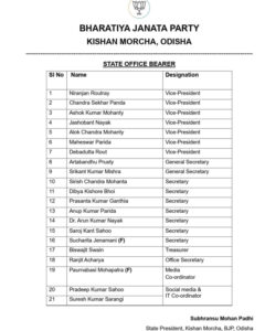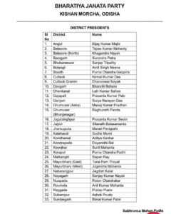 ବିଜେପି ରାଜ୍ୟ କୃଷକ ମୋର୍ଚ୍ଚା ପୁନର୍ଗଠିତ, ଆଲୋକ ମହାନ୍ତି ଉପସଭାପତି,ନିର୍ମଳ ଦାସ କଟକ ଜିଲ୍ଲା ସଭାପତି