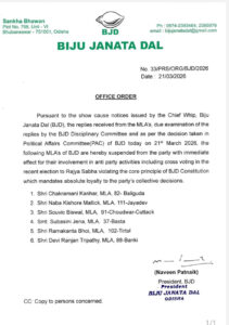 ଭୁବନେଶ୍ୱର,୨୧/୦୩/୨୦୨୬ (ଓଡ଼ିଶା ସମାଚାର/ରଜତ ମହାପାତ୍ର)- ରାଜ୍ୟସଭା ନିର୍ବାଚନରେ କ୍ରସ ଭୋଟିଂ କରିଥିବା ୬ଜଣ ବିଜେଡି ବିଧାୟକ ଙ୍କୁ ବିଜେଡି ଦଳରୁ ନିଲମ୍ବନ କରାଯାଇଛି। ବିଜେଡି ଦଳର ସୁପ୍ରିମୋ ନବୀନ ପଟ୍ଟନାୟକ ସେମାନଙ୍କୁ ନିଲମ୍ବନ କରିଛନ୍ତି।