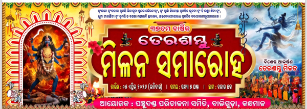 ତେର ଦଣ୍ଡ ମିଳନର କାର୍ଯ୍ୟସୂଚୀ ପ୍ରକାରେ ୫ ତାରିଖ ରବିବାର ସକାଳ ୮ଘଣ୍ଟା ସମୟରେ ମା’ ପାଟ୍ଟଖଣ୍ଡା ମନ୍ଦିରରେ ୧୩ ଦଣ୍ଡ ଥଳର ବରଣ କରାଯିବ । ଦିବା ଘ.୧୧.୩୦ମି.ସମୟରେ ମେଇନ୍ରୋଡ଼ ରେ ଧୂଳିଦଣ୍ଡ ଅନୁଷ୍ଠିତ ହେବ । ଅପରାହ୍ନ ଘ.୦୪.୩୦ ମି.ସମୟରେ ବନ୍ଧପାଖରେ ପାଣିଦଣ୍ଡ ର ଆୟୋଜନ କରାଯିବ । ସନ୍ଧ୍ୟା ୦୫ ଘଟିକା ସମୟରେ ଟାଉନର ବଜାର ଛକ ନିକଟରେ ଅଞ୍ଚଳର ସବୁଠାରୁ ଆକର୍ଷଣୀୟ ୧୩ ଦଣ୍ଡର ମହାମିଳନ ଖୁବ ଯାକ ଜକମକରେ ଆୟୋଜନ କରାଯିବ । ରାତ୍ର ୮ ଘଣ୍ଟ ଠାରୁ ୧୨ ଘଣ୍ଟ ପର୍ଯ୍ୟନ୍ତ ବିଭିନ୍ନ ପ୍ରକାର ସାଂସ୍କୃତିକ କାର୍ଯ୍ୟକ୍ରମ ସହ ରାତ୍ର ୧୧ ଘଣ୍ଟ ସମୟରେ ଝୁଣାଦଣ୍ଡ ର ଏକ ବିରାଟ ପଟୁଆର ହେବା ସହ ୬ ତାରିଖ ସକାଳ ୦୮ଘଣ୍ଟ ସମୟରେ ଯାତ୍ରା ସମାପ୍ତ ହେବ । ଏଣୁ ଏହି କାର୍ଯ୍ୟକ୍ରମ ରେ ବହୁ ସଂଖ୍ୟା ରେ ଯୋଗ ଦେବାପାଇଁ ସମିତି ତରଫରୁ ଅନୁରୋଧ କରାଯାଇଛି ।