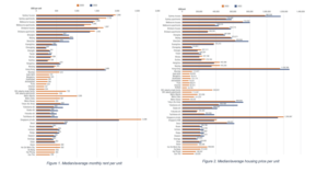 Average monthly rent per unit and average housing price per unit