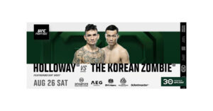 UFC® FIGHT NIGHT: HOLLOWAY vs. THE KOREAN ZOMBIE takes place on Saturday, August 26, in local prime time at the Singapore Indoor Stadium, featuring two of the best featherweights in the world, #2 former title contender Max “Blessed” Holloway versus #7 “The Korean Zombie” Chan Sung Jung. The event will begin at 5p.m.SGT, followed by the main card at 8p.m.
