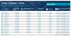 Greater China Retail Supply/Demand Trends report. According to the report, by Q2 2023, the total prime retail property stock in the core markets in the 16 major cities in Greater China we track totalled 106.0 million sq m. Many international and domestic brands either opened their first store or accelerated their business expansion in China, demonstrating an increasing demand for retail space in the market. The total premium core city retail property net absorption across the Greater China market for the first half of the year was 2.66 million sq m. The overall vacancy rate seen in the 16 major cities in Greater China decreased to 11.01% in Q2 2023.