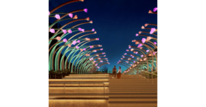 As evening fades into night, this plaza bursts into life with animated light beams extending skyward, beckoning guests from afar towards Sensoryscape.